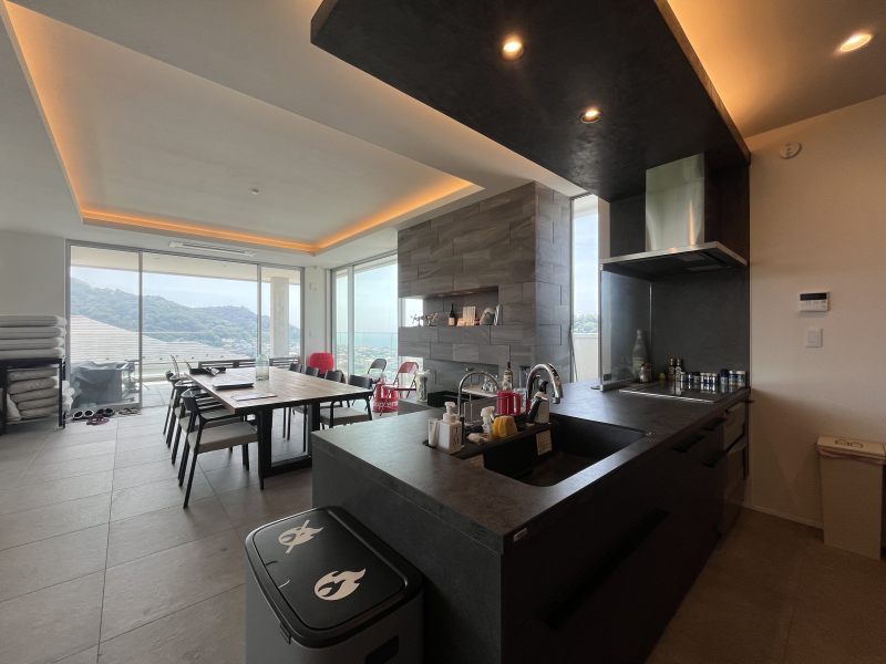 キッチンでお料理しながらも海と緑が。