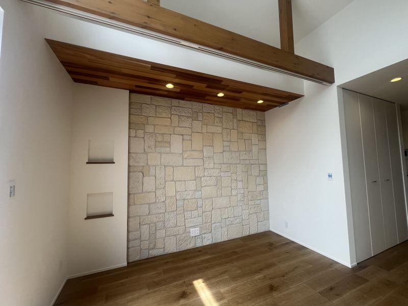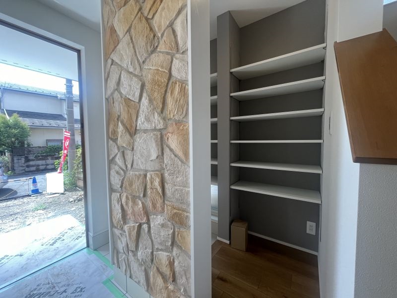 広いシューズクロークは、石素材のアクセントがオシャレです。