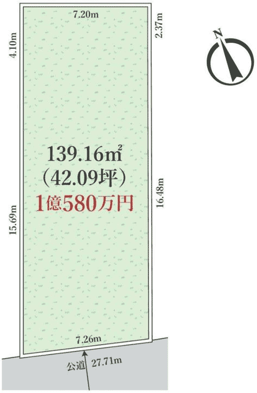 土地の広さは139平米。接道は7.26mで縦長の形状をしています。