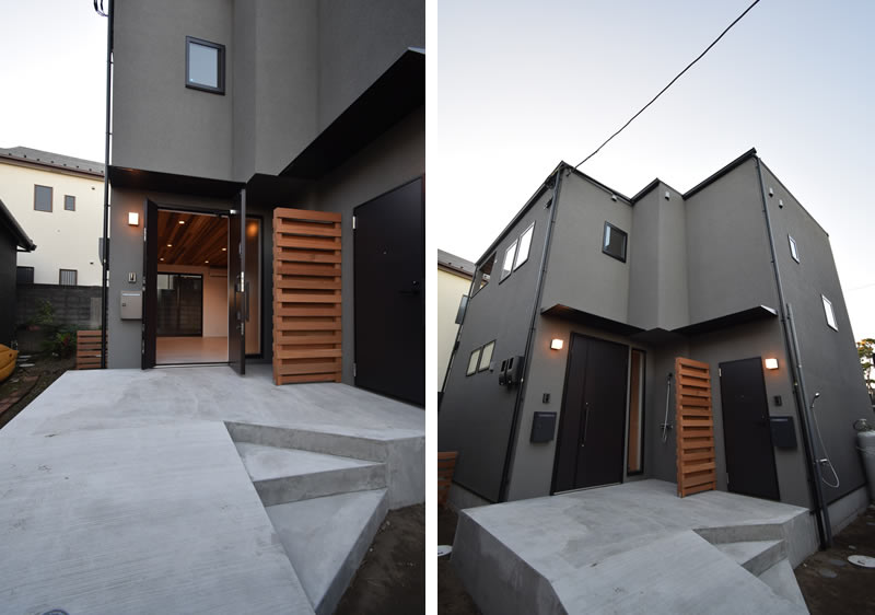 鵠沼ベース外観。玄関扉が両側開きで土間リビングへのアクセスは楽ラク。