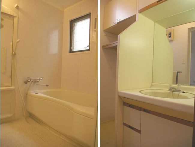 水回り 左:ゆったりとしてバスルーム。窓有り。右:洗面