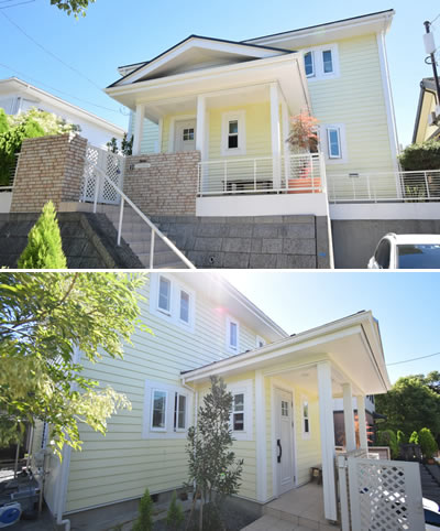 逗子アーデンヒルという周囲は緑風がそよぐエリアの静かで綺麗な分譲地に建てられた高台の戸建住宅。外観は淡いイエローの落ち着いたカラー。窓枠ドア枠の白の色使いがプランテーションハウスのような趣を醸しとってもいい雰囲気。建物は131㎡で間取りは3LDK。加えてレッドシダーを貼った自然素材のサンルーム(5.4帖)とウッドデッキ(約6帖)という構成。自然光と風が室内にやさしく差し込みLDKと窓外とを水平に繋げ、ゆったり感が心地いい住まい。