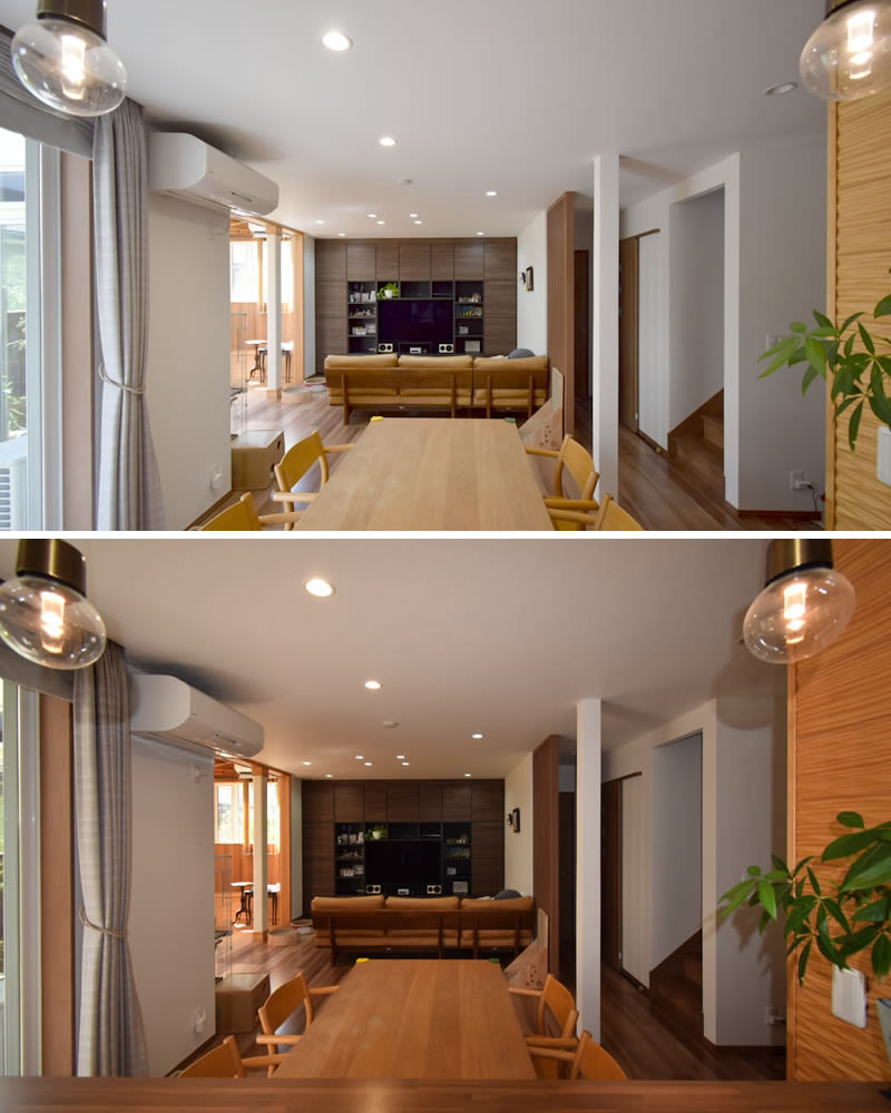 LDKとサンルームまでつながる空間。窓外の緑を取り込んで。LDには床暖房が敷設されています。