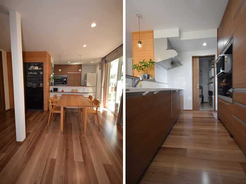 左:ダイニングと魅せる食器棚 右:キッチンはIHであるので日常生活で生火を使うことありません。キャビネットもあって収納も充実。手元も見えないよう仕切りを設置。パントリー、洗濯ルーム、玄関まで繋がる動線。