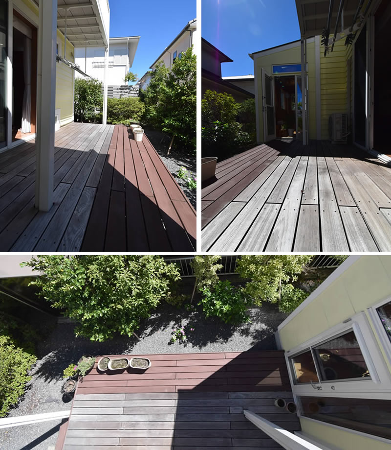 6帖程度のウッドデッキ。緑を感じながらアウトドアリビング。小さいお子様の夏はプールで楽しめる。