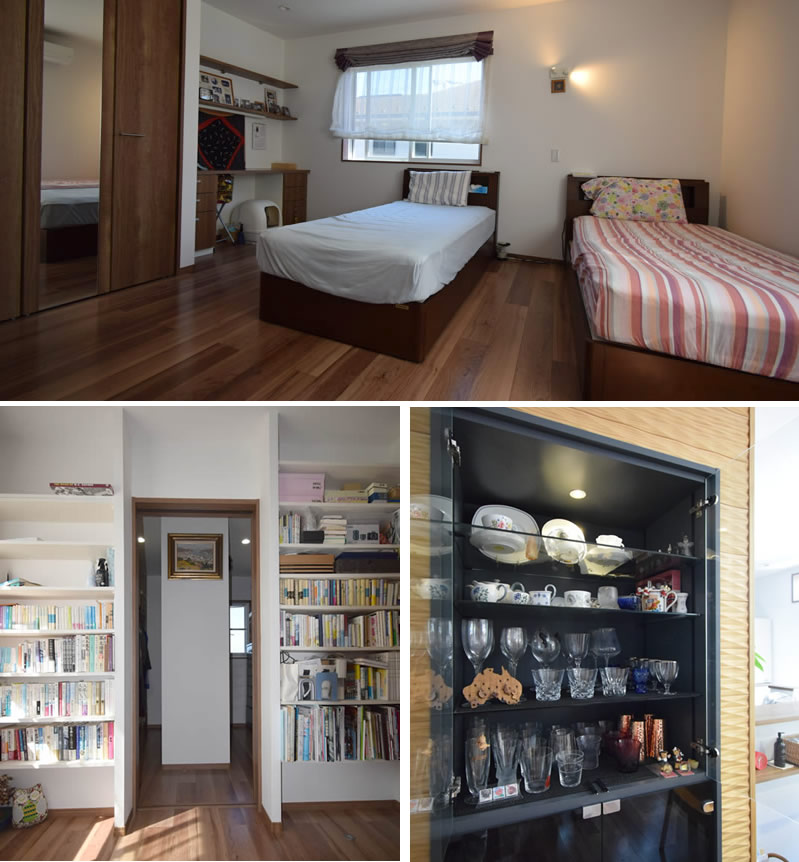 上:寝室。左:夫婦で分かれて使えるウォークインクローゼットと書棚。右:食器やワイングラス、ソーサー。魅せる食器棚はダイニング横。