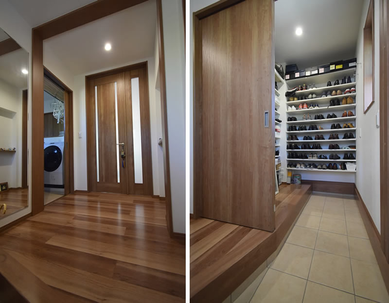 玄関、そして広々、見やすく靴を並べたSIC、収納力はかなりと強め。