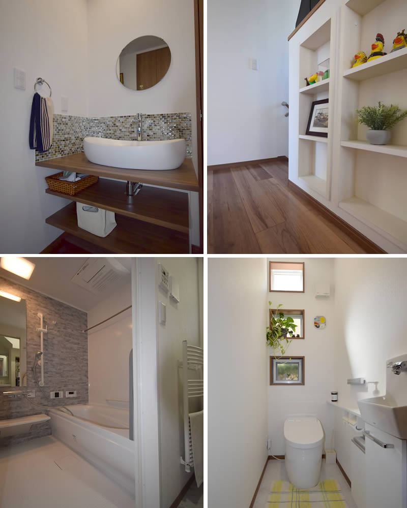 上:2階に設けられた手洗いやニッチ棚。下:バスルーム。タオルウォーマーも設置。浴室はミスとサウナ機能付き暖房換気扇付