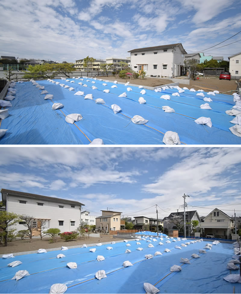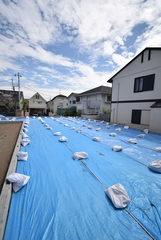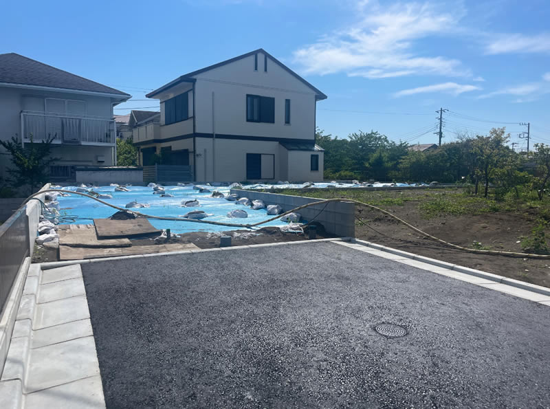 西側を撮影。2階建ての建物が建ち2階から見れば、この方向に富士山が見えるかもしれません。左のブルーシートがかかっている区画です。