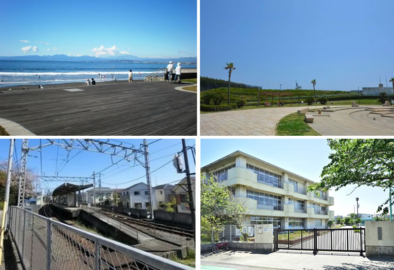 近隣周辺の写真。鵠沼海岸や、鵠洋小学校。